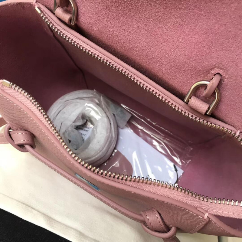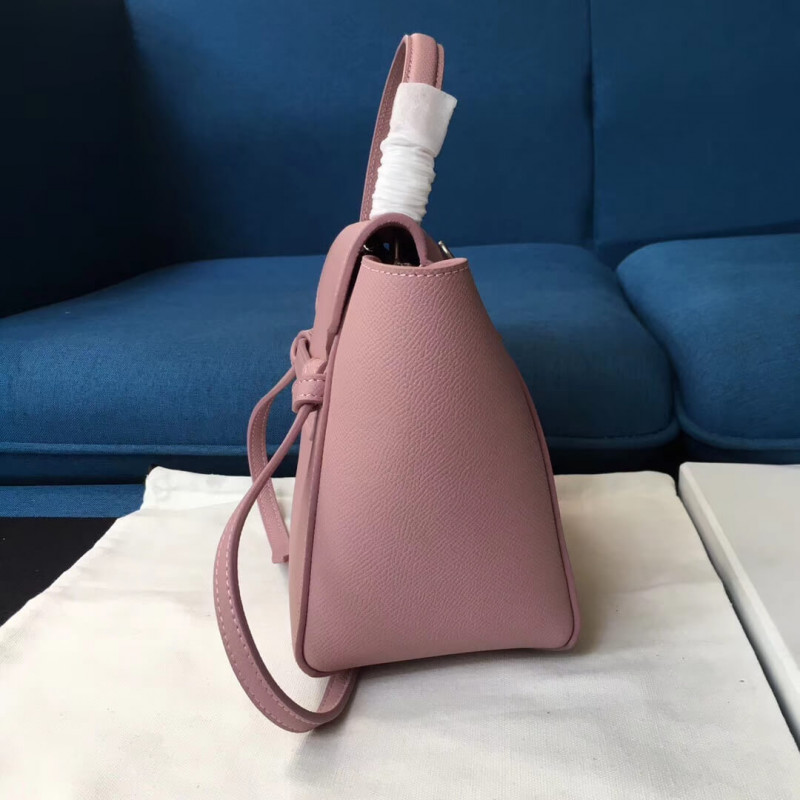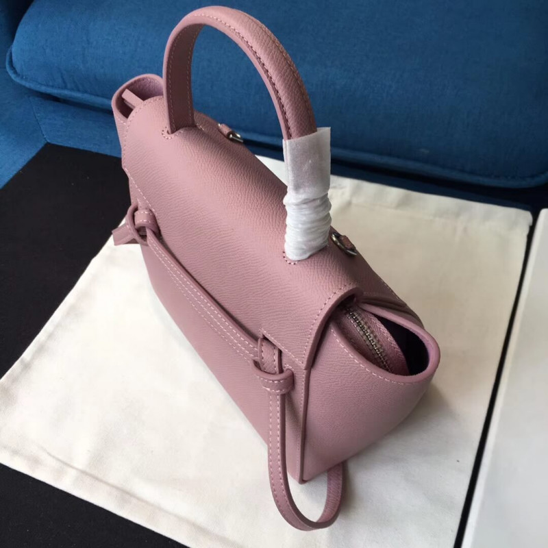 Micro belt bag in grained calfskin with a leather handle, a removable shoulder strap, and a zipped outer pocket on the back. The bag closes two ways: top flap and zipper.