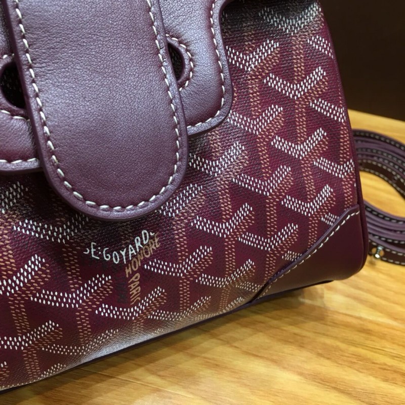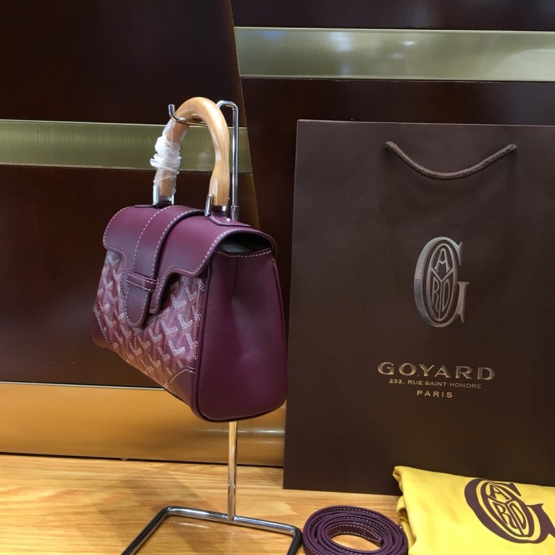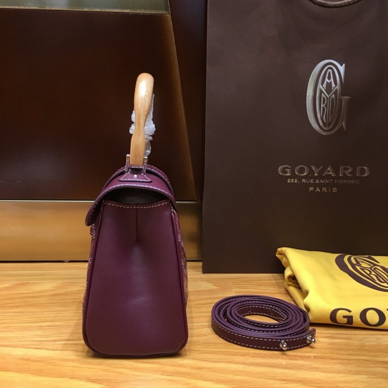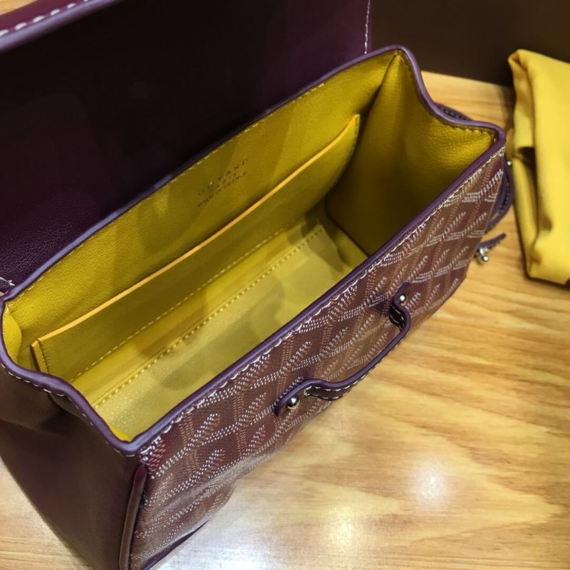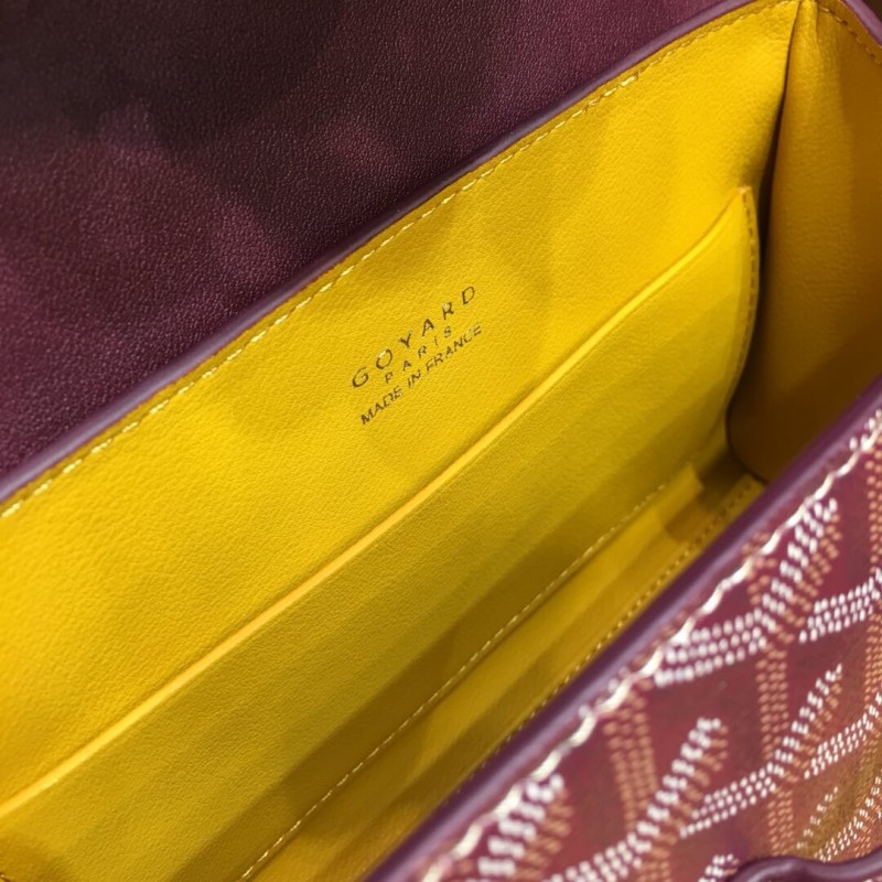 This stylish mini bag is crafted of gray coated canvas with the classic Goyard chevron design. The bag features a wooden handle, a leather shoulder strap and leather trim. The cross-over leather top flap opens to a lemon leather interior with a flat pocket.