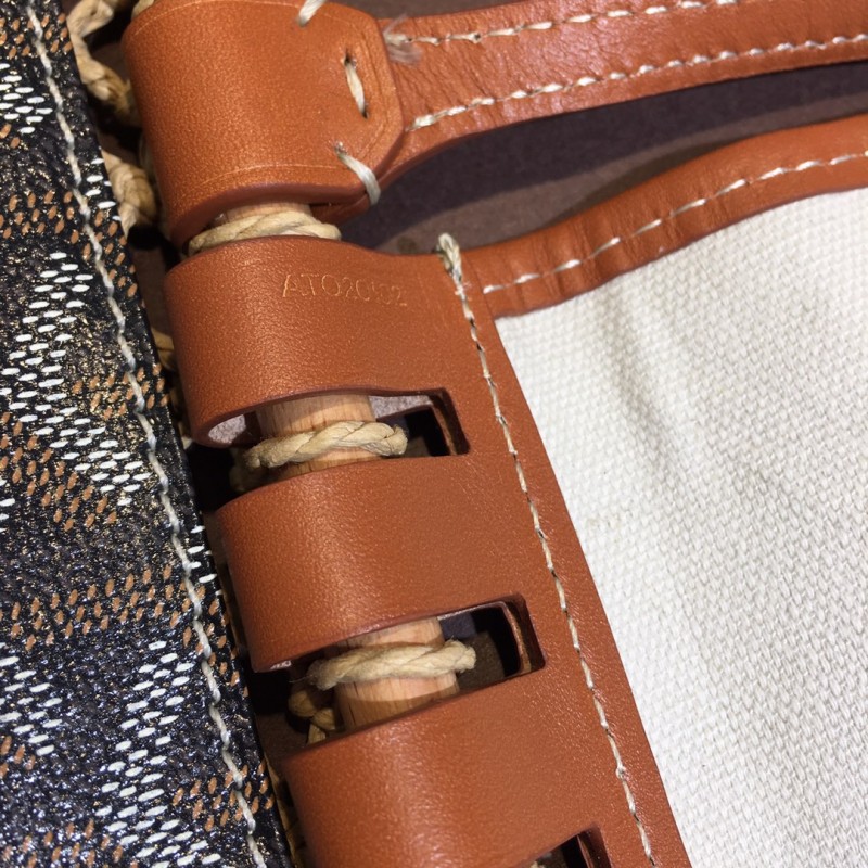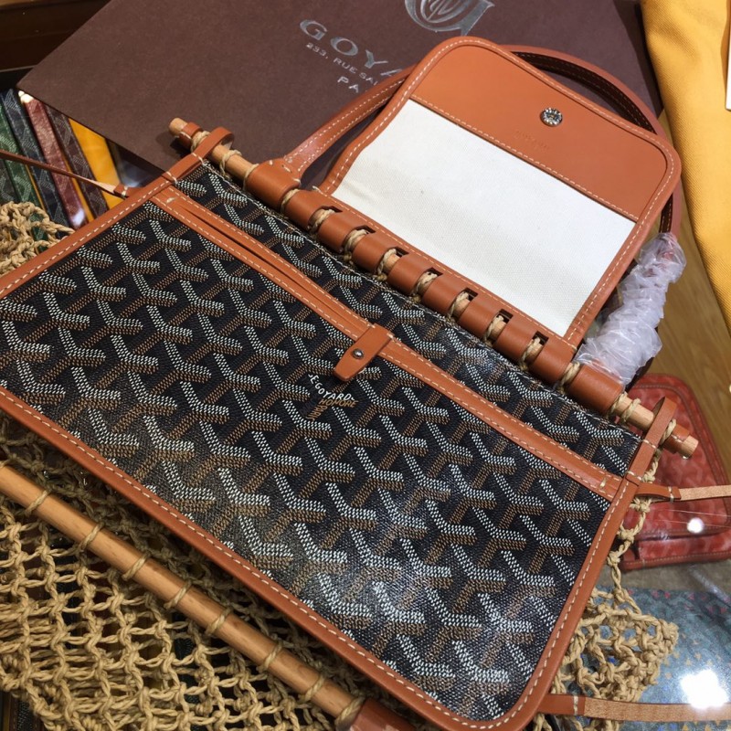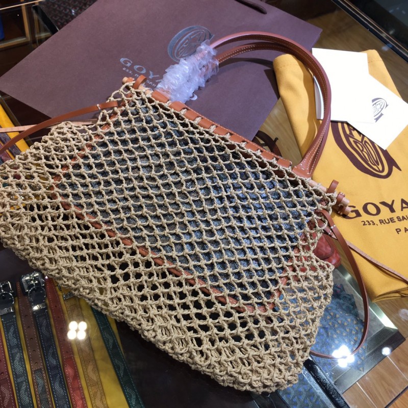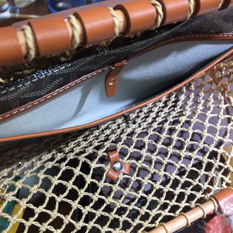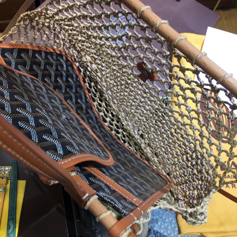This stylish tote is luxuriously crafted of raffia mesh hand plaited detail to look like a net. The handbag features Goyardine coated canvas flap pouch over wooden rods with leather handle straps. The top opens to a pouch over netted material.