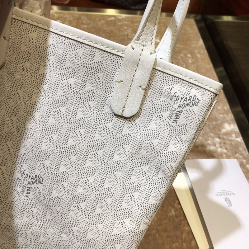 This is a relaxed and sturdy mini tote that features the traditional Goyard chevron in grey and white. The tote has thin leather handles with an open top and a fabric interior.