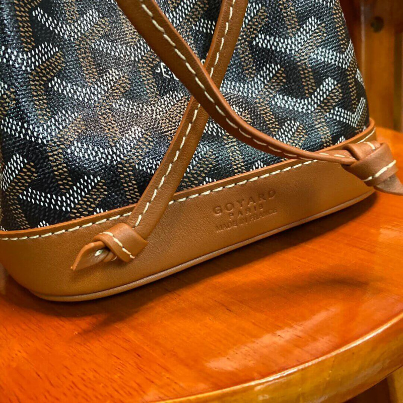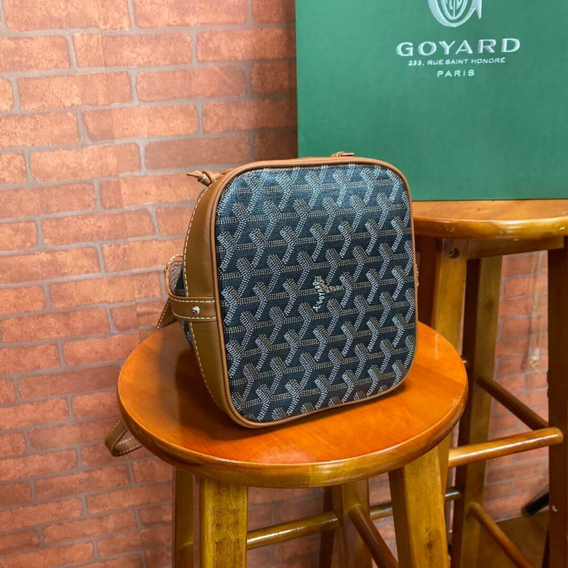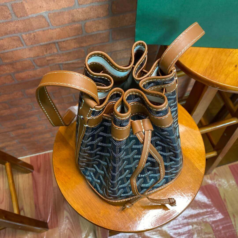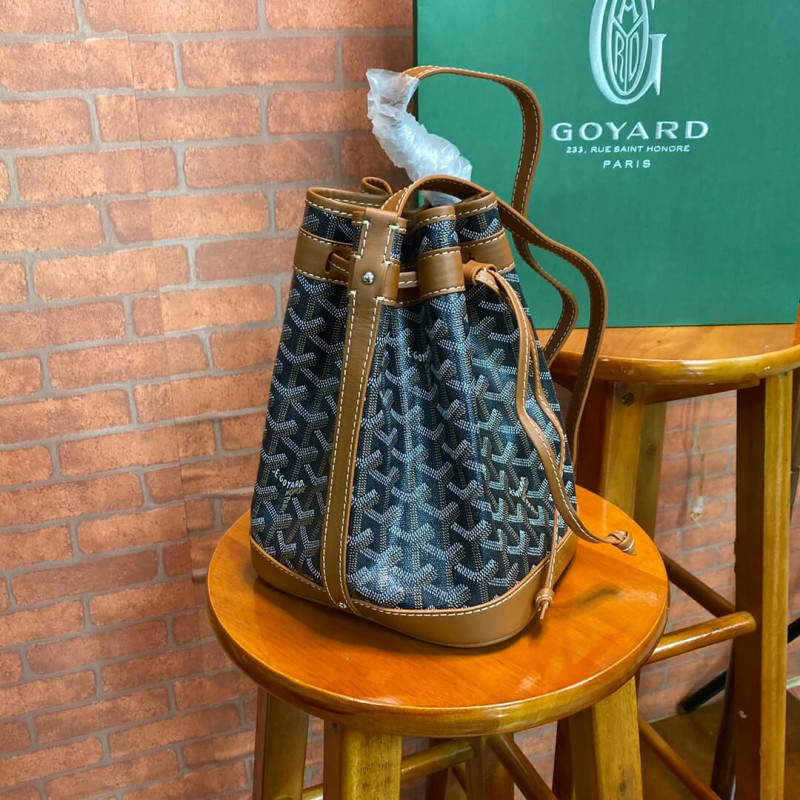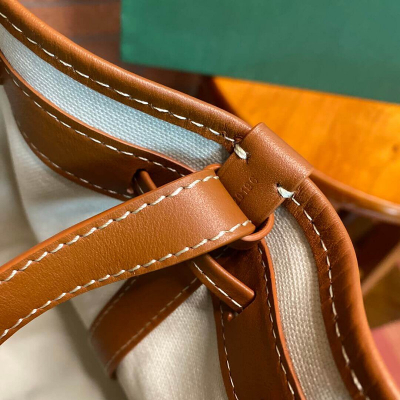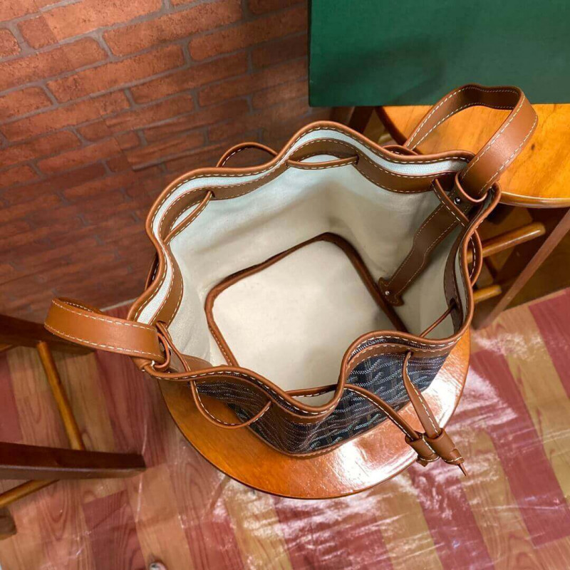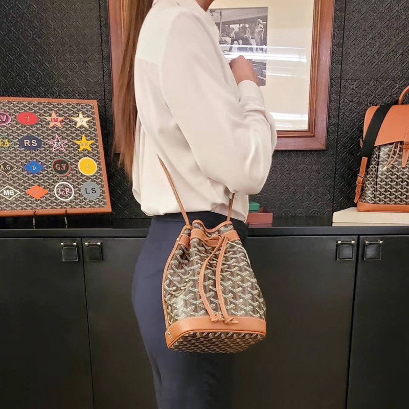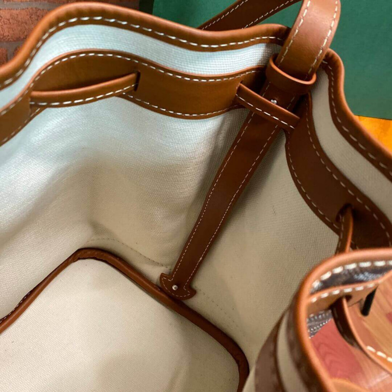 This bucket bag is crafted of traditional Goyard chevron monogram on grey coated canvas. The tote features grey leather trim and long shoulder strap. The top is opens to a beige fabric interior.