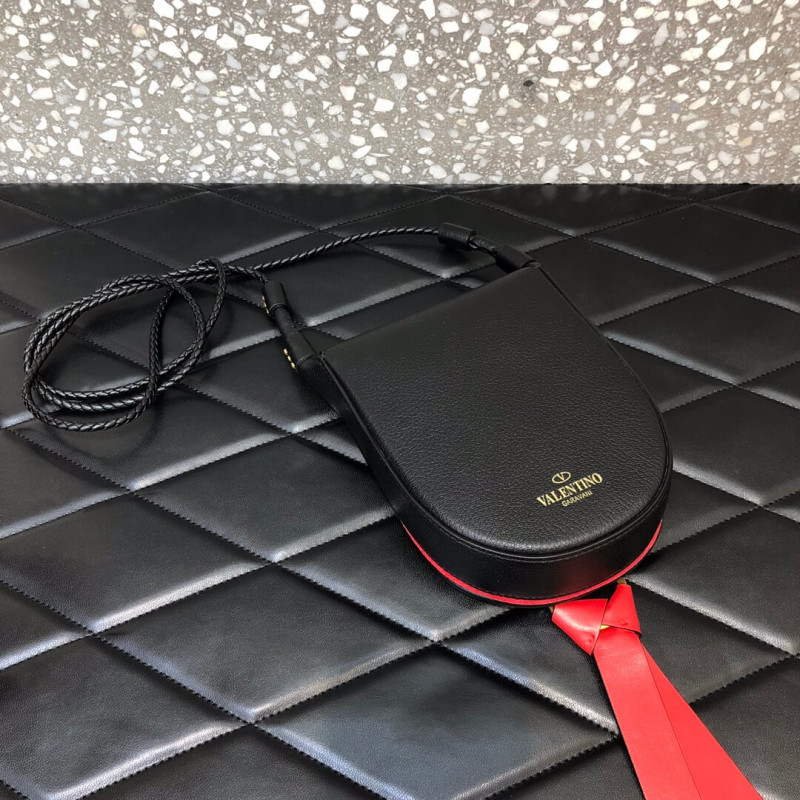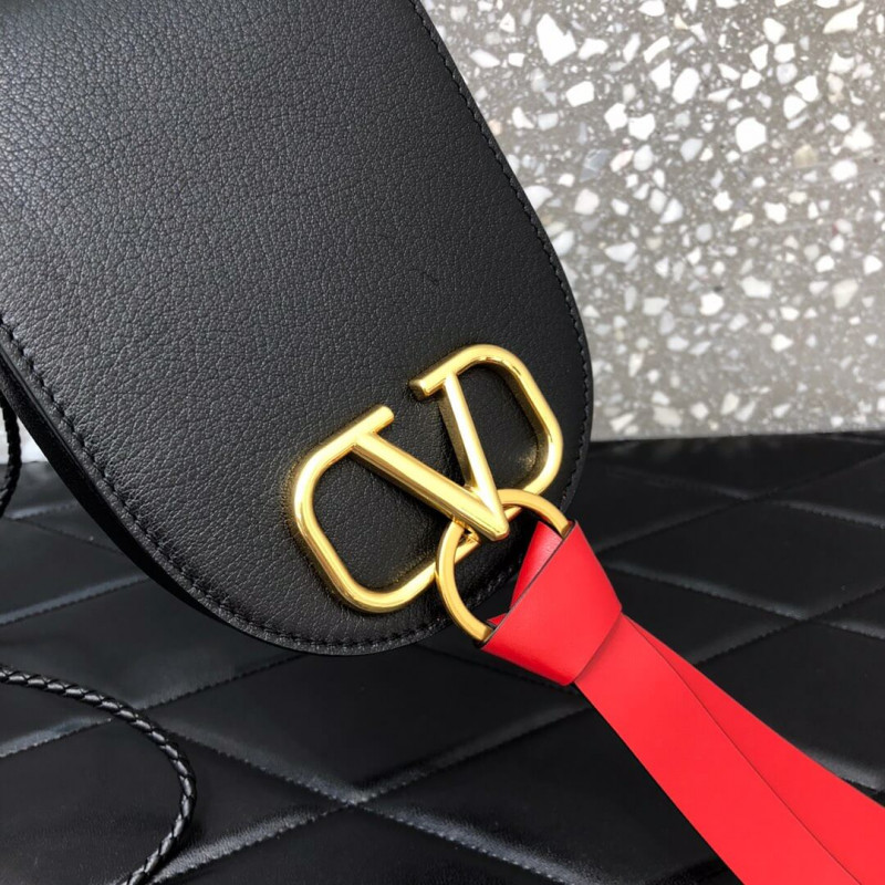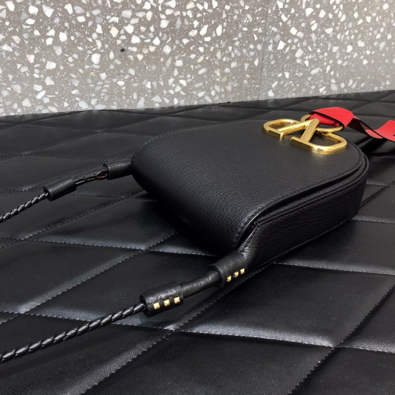 Valentino Garavani VRING small goatskin crossbody bag. This bag features a metal logo, adorned with a ring and tie.