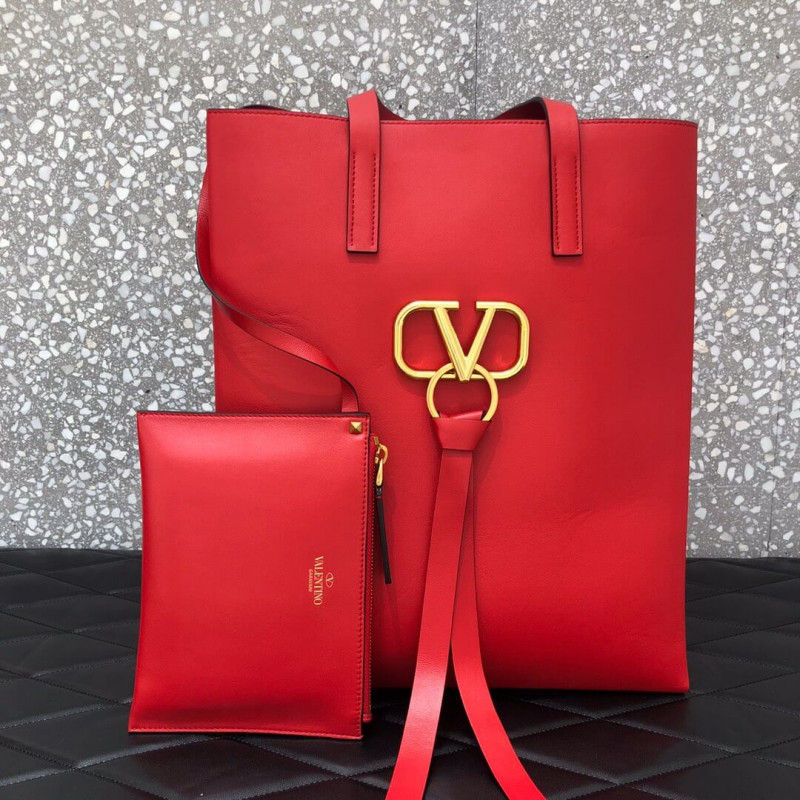 Valentino Garavani N/S VRING calfskin shopper. This bag features a metal logo, adorned with a ring and tie.