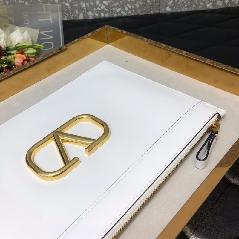 Valentino Garavani VRING calfskin pouch. This pouch features a metal logo, adorned with a ring and tie.