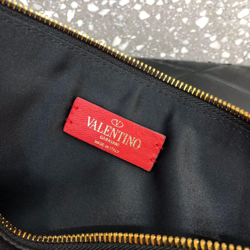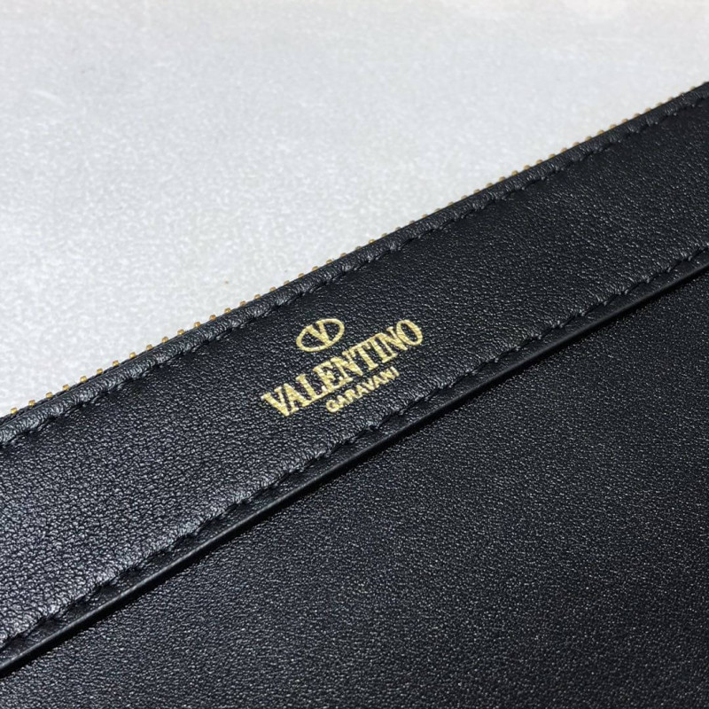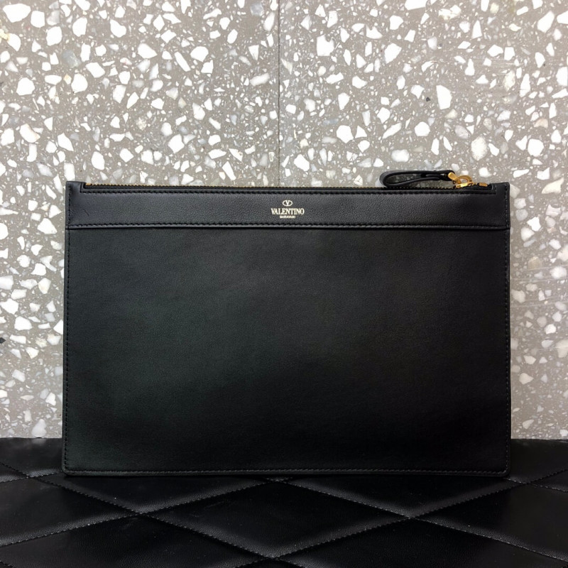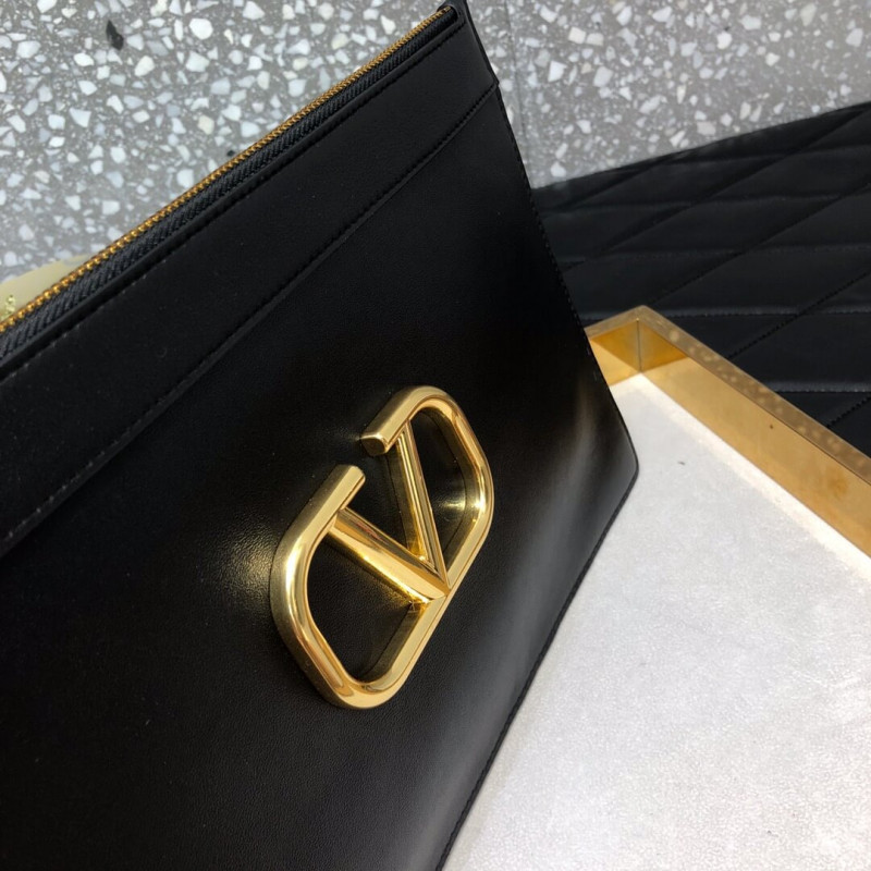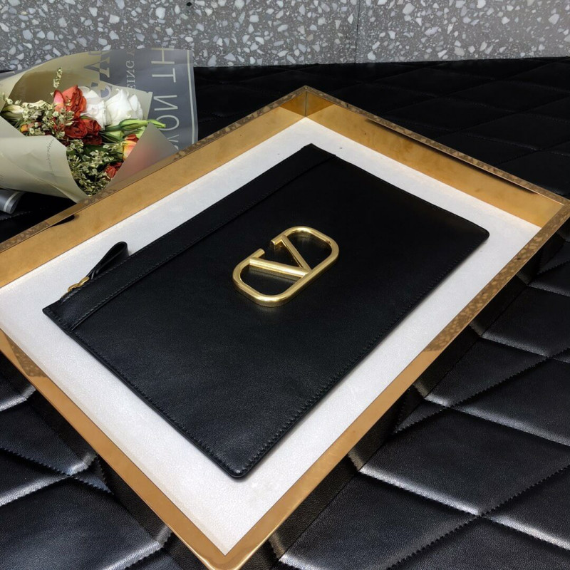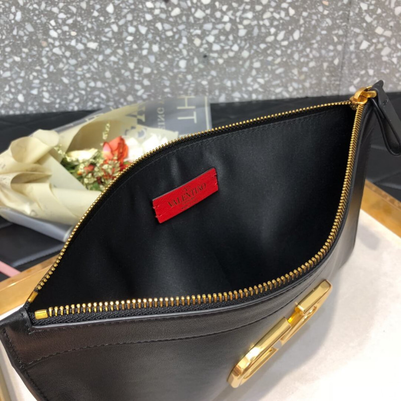 Valentino Garavani VRING calfskin pouch. This pouch features a metal logo, adorned with a ring and tie.