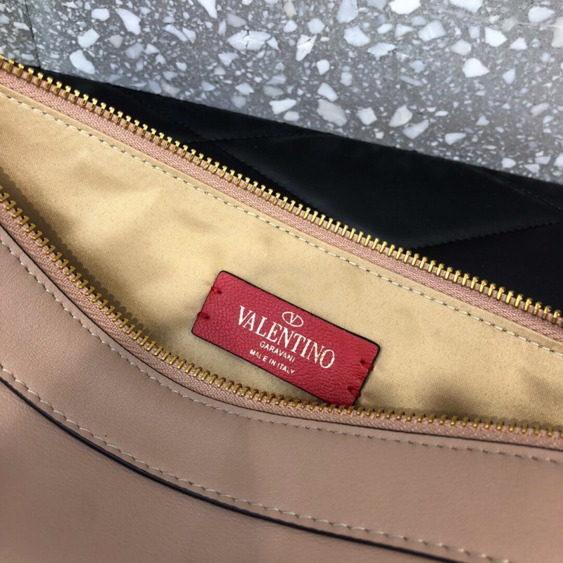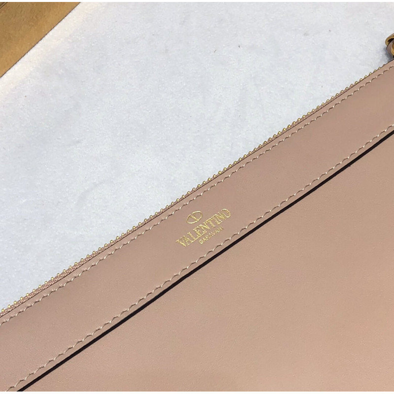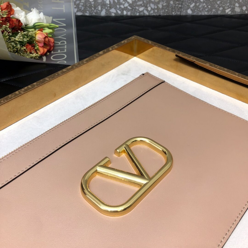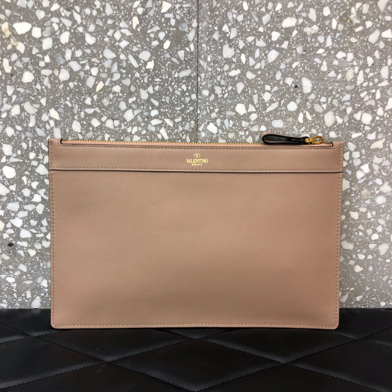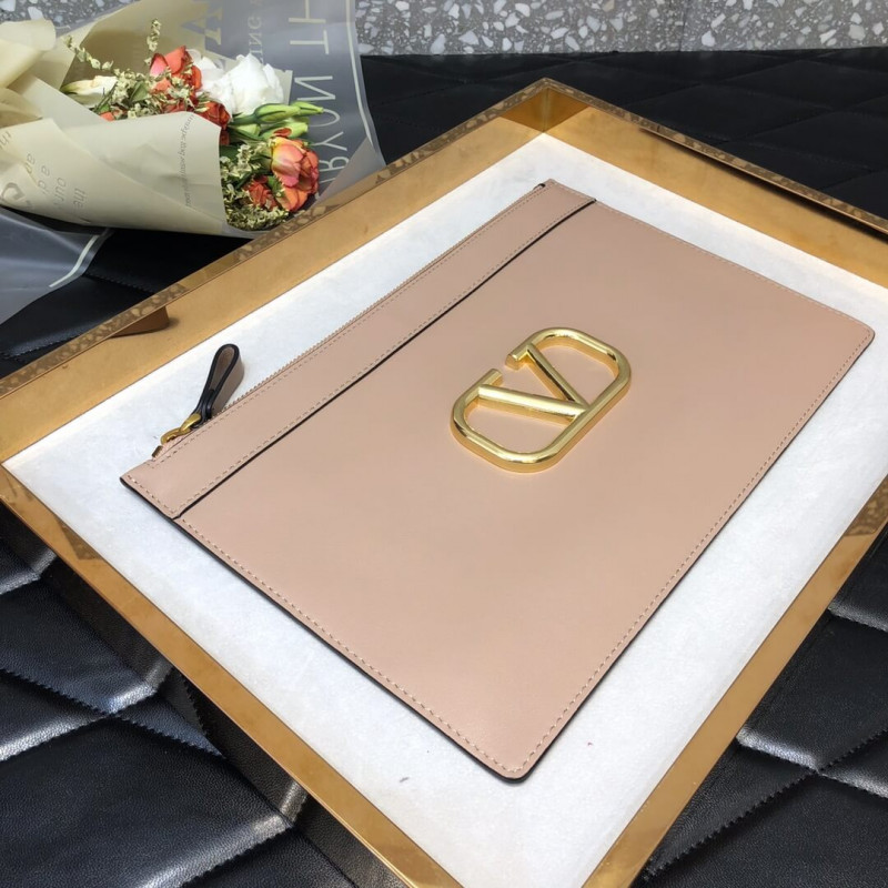 Valentino Garavani VRING calfskin pouch. This pouch features a metal logo, adorned with a ring and tie.