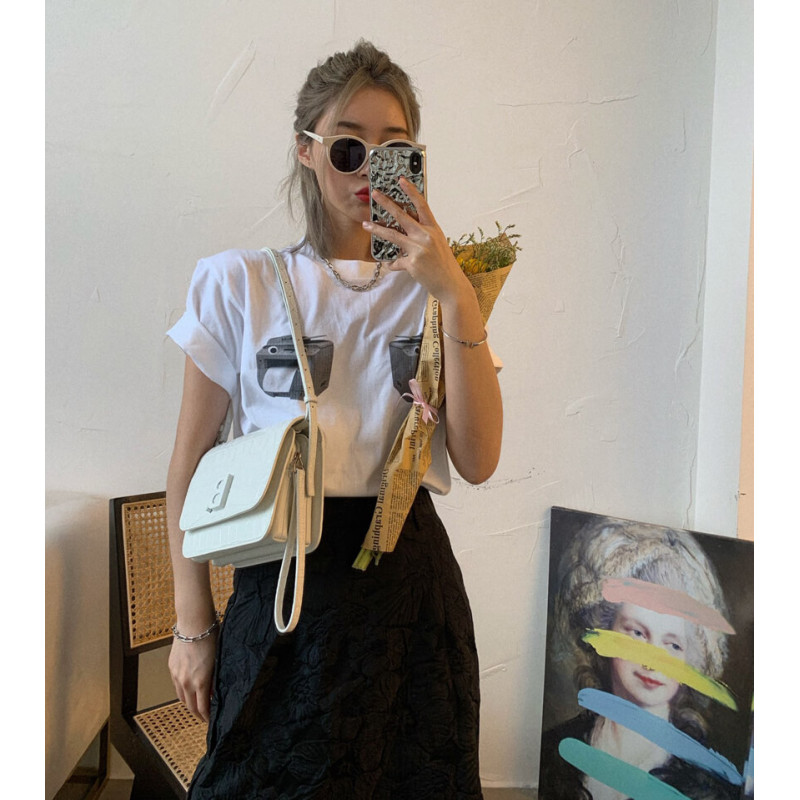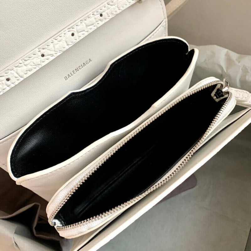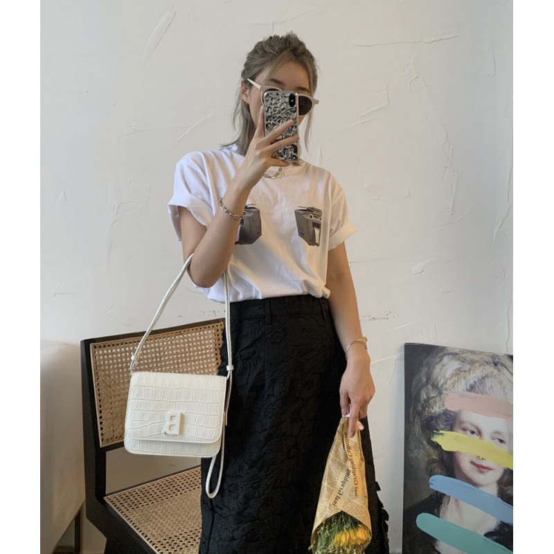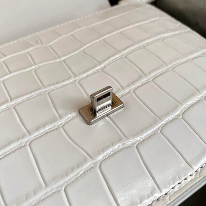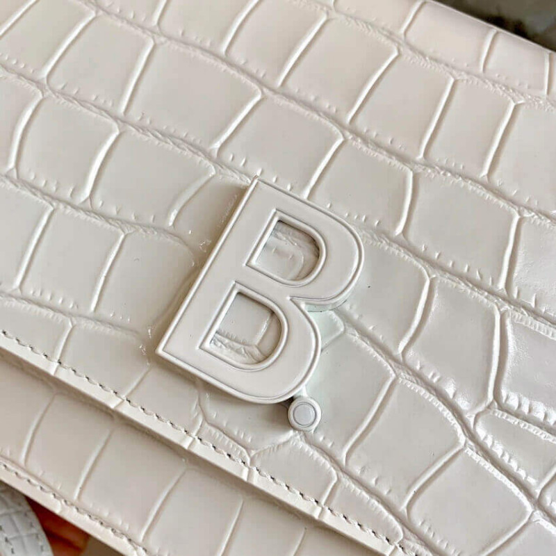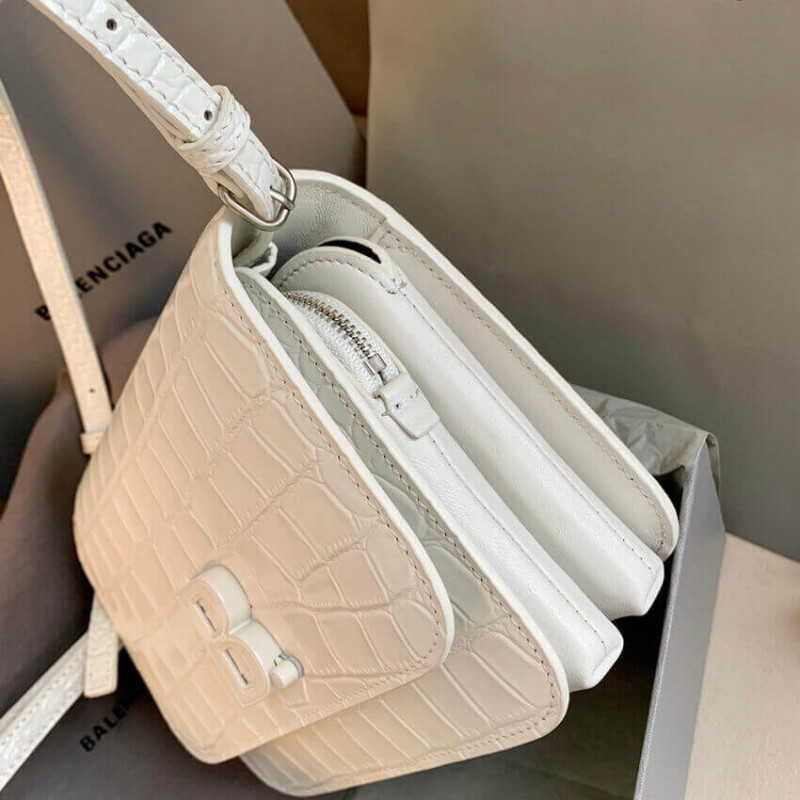 Croc-embossed calfskin shoulder bag. Detachable and adjustable shoulder strap with pin-buckle fastening. Logo hardware at face. Patch pocket at back face. Foldover flap with turn-lock fastening. Embossed logo, zippered pocket, and two patch pockets at two-compartment interior. Buffed leather lining in black. Silver-tone hardware.