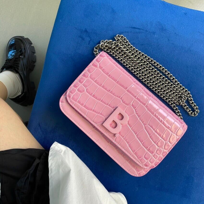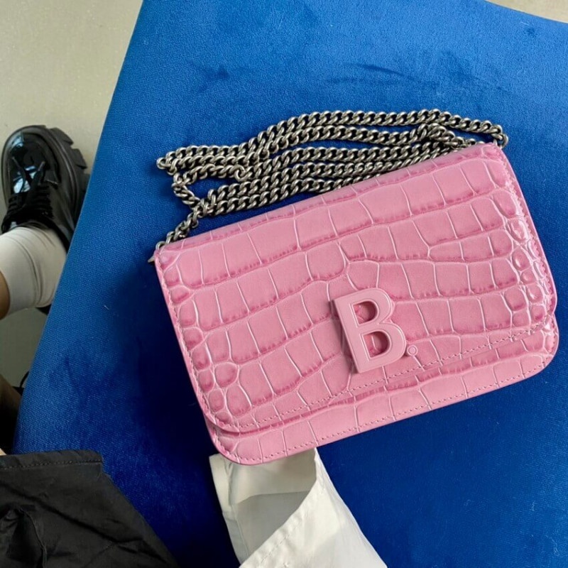 Opulent crocodile-embossed bag with a polished B plaque at the flap.