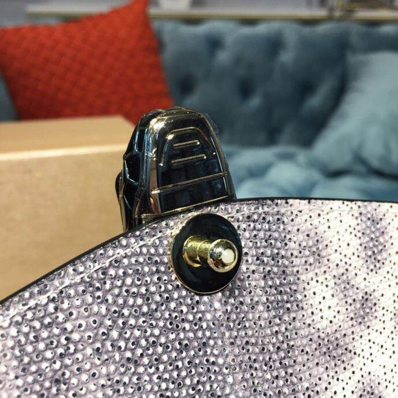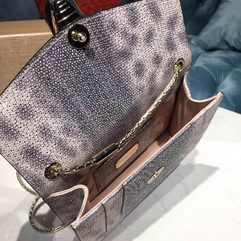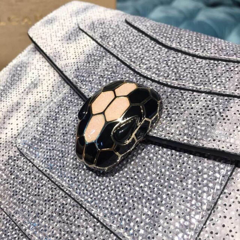 The “Serpenti Forever” crossbody bag is tinged with new nuances for the upcoming season. Crafted in precious white agate metallic karung skin, this bag embodies the expertise of Bvlgari artisans in mastering precious materials to create timeless pieces. The iconic snakehead closure hypnotises with black and white agate enamel and seductive eyes in black onyx. A light gold plated chain, inspired by the sinuosity of the snake’s body and a small pocket mirror complete this model. Small size with single gusset.
