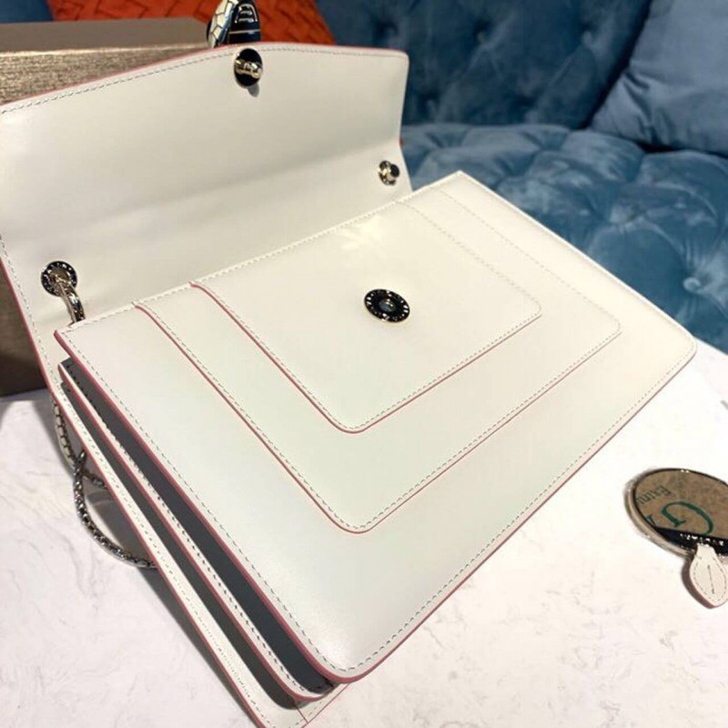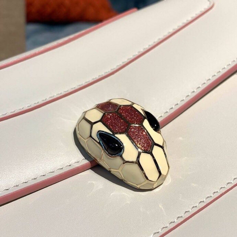 Crafted in smooth candy quartz and rhapsody opal calf leather, the "Serpenti Forever" crossbody bag is reinterpeted with a pop twist for the Winter Holidays season.