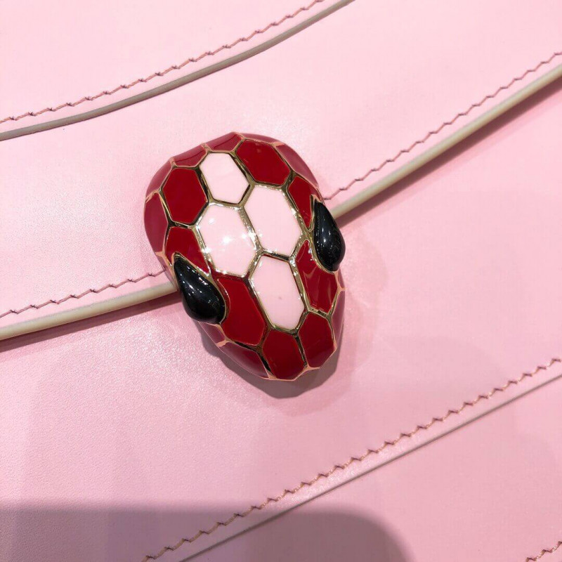 Crafted in smooth candy quartz and rhapsody opal calf leather, the "Serpenti Forever" crossbody bag is reinterpeted with a pop twist for the Winter Holidays season.