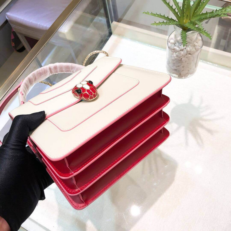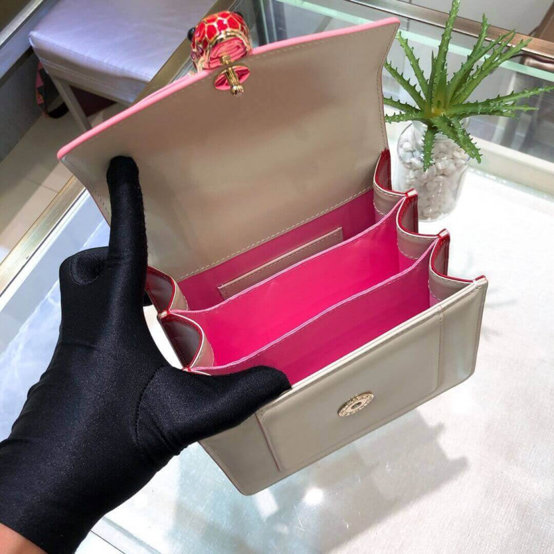 Flap cover bag Serpenti Forever in calf leather and jade green gros-grain lining.Brass light gold plated hardware and snake head closure in black and white enamel with eyes in green malachite.Flap cover bag Serpenti Forever in black calf leather and jade green gros-grain lining. Brass light gold plated hardware and snake head closure in black and white enamel with eyes in green malachite. Top handle model featuring three gussets, with adjustable and removable snake-body shaped chain and leather strap. Small size. Also available in other colours.