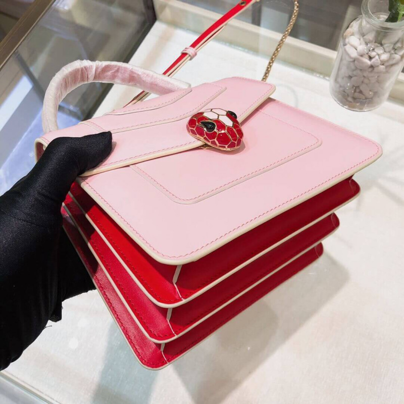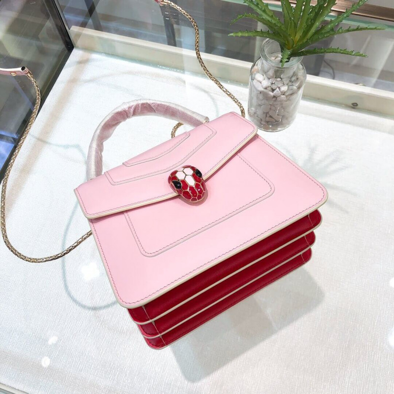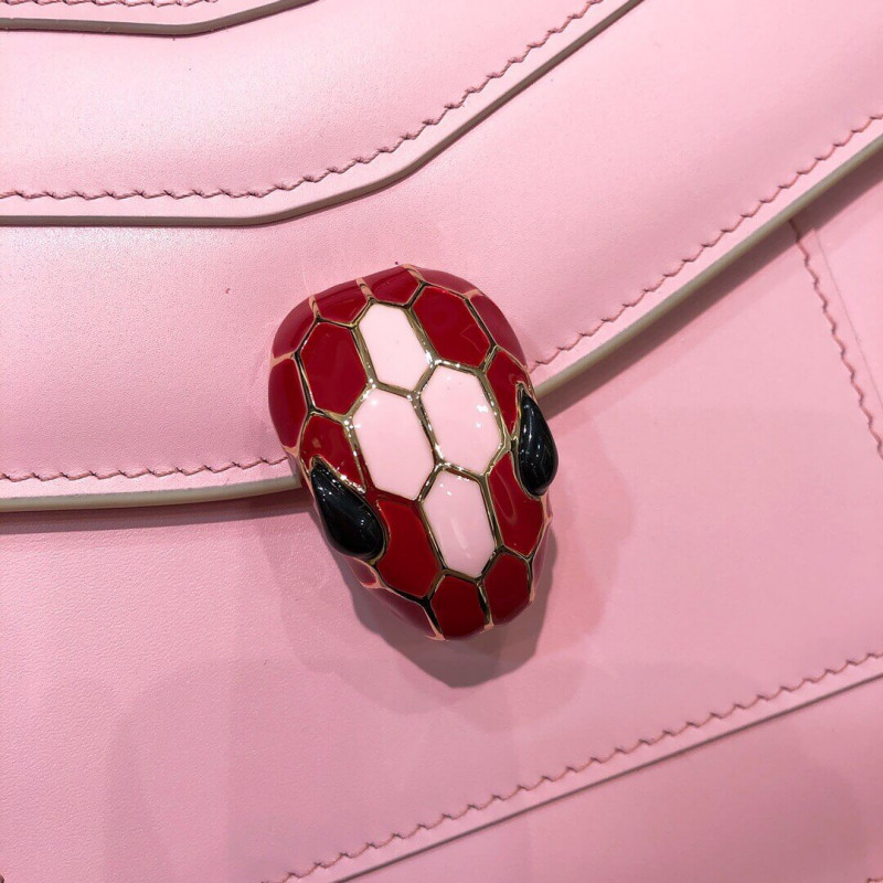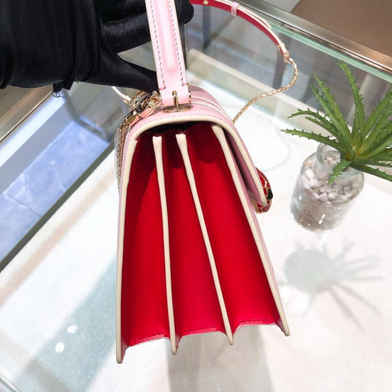 Flap cover bag Serpenti Forever in calf leather and jade green gros-grain lining.Brass light gold plated hardware and snake head closure in black and white enamel with eyes in green malachite.Flap cover bag Serpenti Forever in black calf leather and jade green gros-grain lining. Brass light gold plated hardware and snake head closure in black and white enamel with eyes in green malachite. Top handle model featuring three gussets, with adjustable and removable snake-body shaped chain and leather strap. Small size. Also available in other colours.