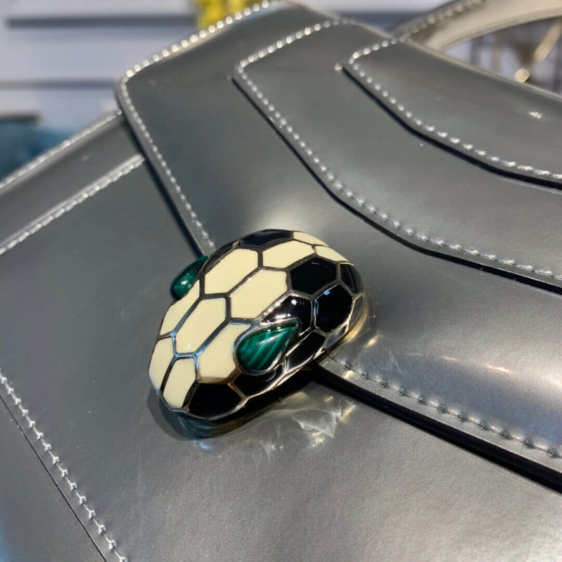 Flap cover bag Serpenti Forever in silver brushed metallic calf leather. and jade green gros-grain lining.Brass light gold plated hardware and snake head closure in black and white enamel with eyes in green malachite.Flap cover bag Serpenti Forever in black calf leather and jade green gros-grain lining. Brass light gold plated hardware and snake head closure in black and white enamel with eyes in green malachite. Top handle model featuring three gussets, with adjustable and removable snake-body shaped chain and leather strap. Small size. Also available in other colours.