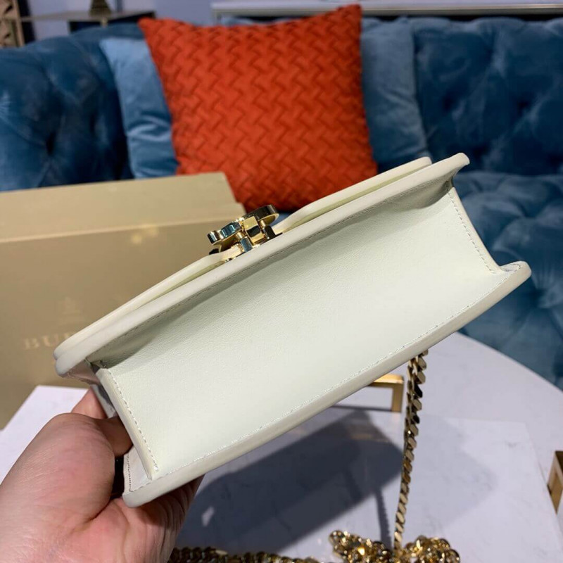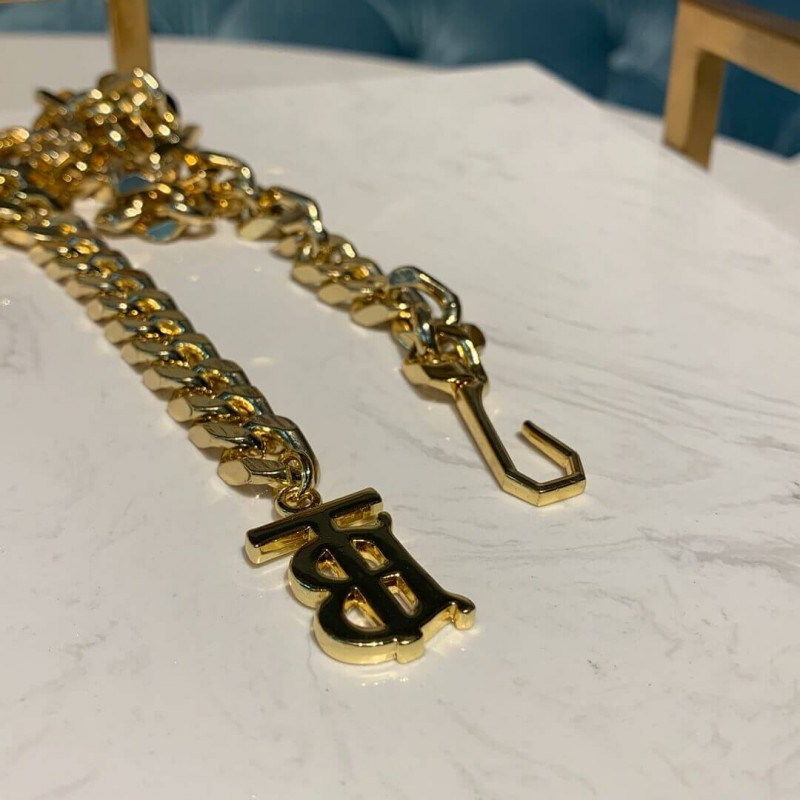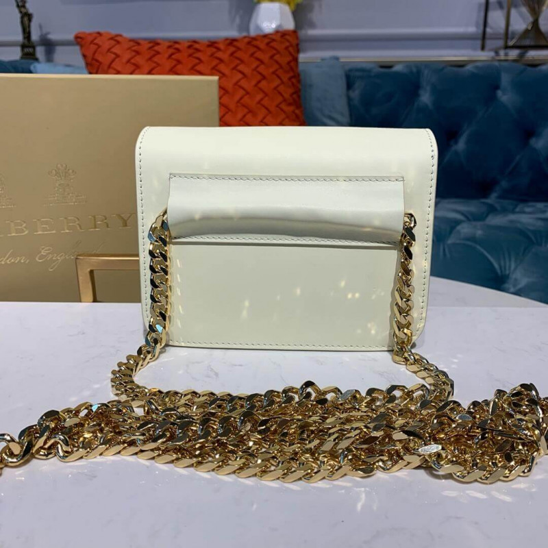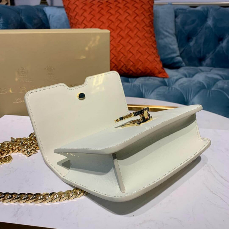 A structured leather bum bag with a Thomas Burberry Monogram clasp and a chain strap for wearing around the waist. Detach the strap to carry as a clutch.