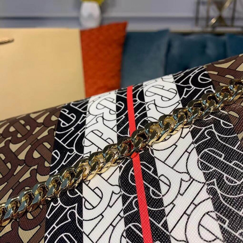 An envelope clutch in our new e-canvas – an environmentally conscious canvas, primarily made using renewable resources that require less water and generate less CO2 than conventional coated canvases – with a Thomas Burberry Monogram clasp, reworking a 1930s style from the archive. Use the detachable chain shoulder strap to keep hands free.