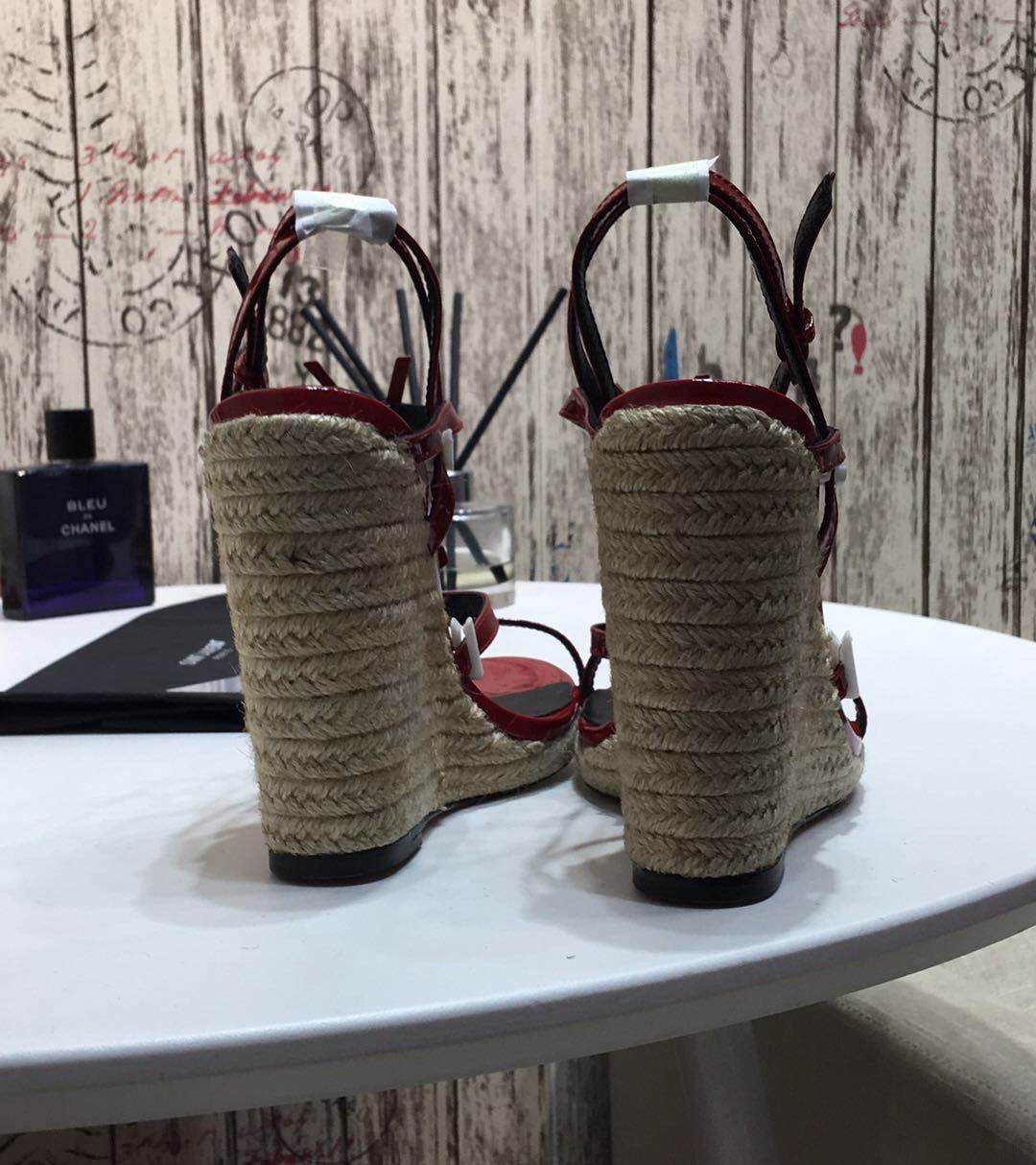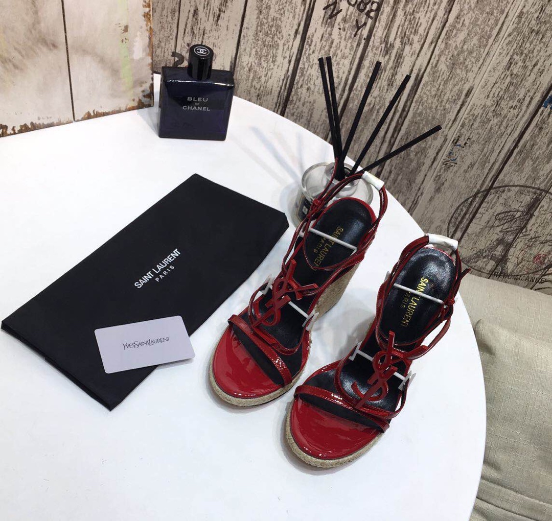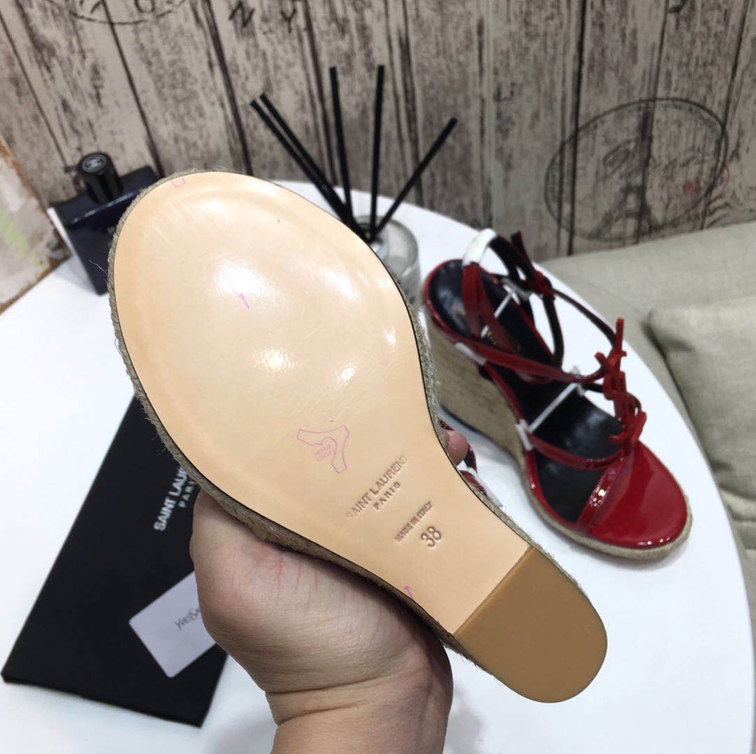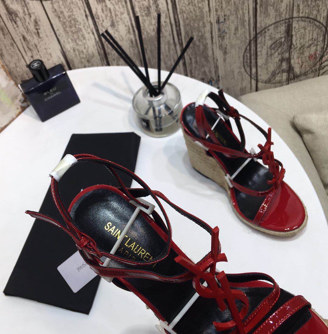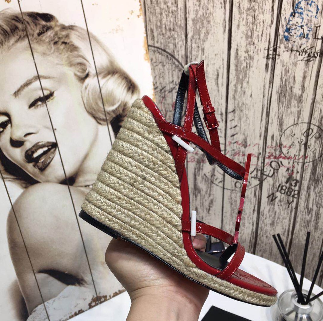 Saint Laurent YSL-CASSANDRA Logo Letter Buckle High-heeled Straw Woven Leather Wedges