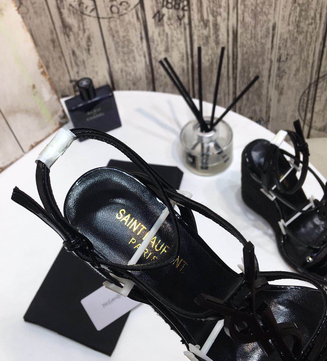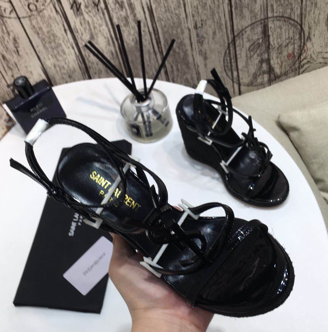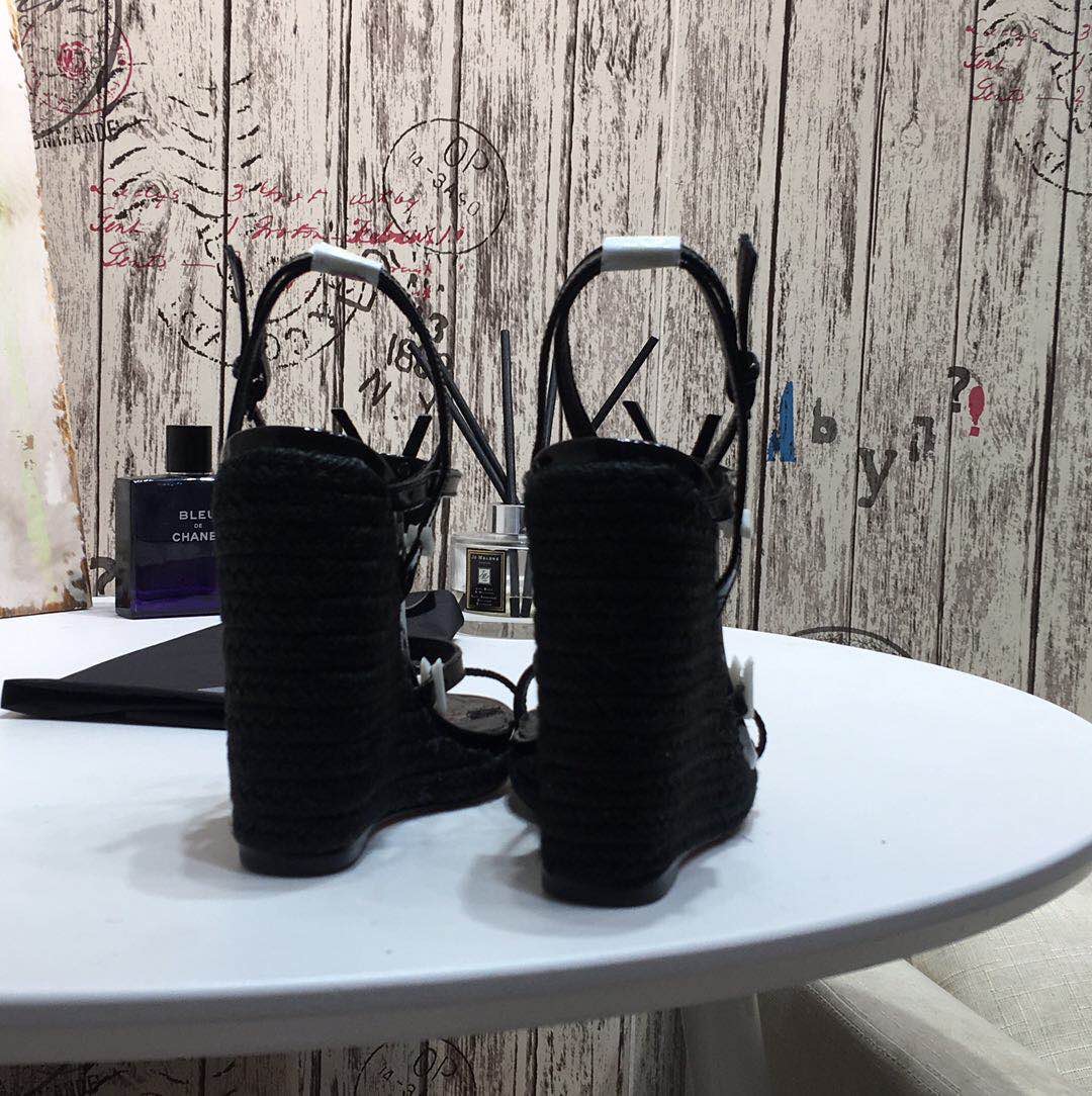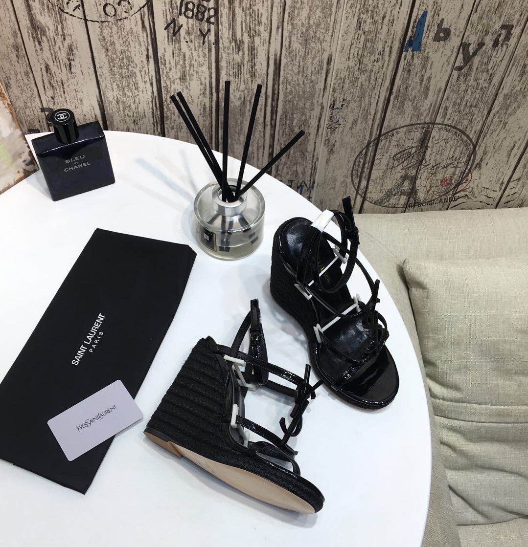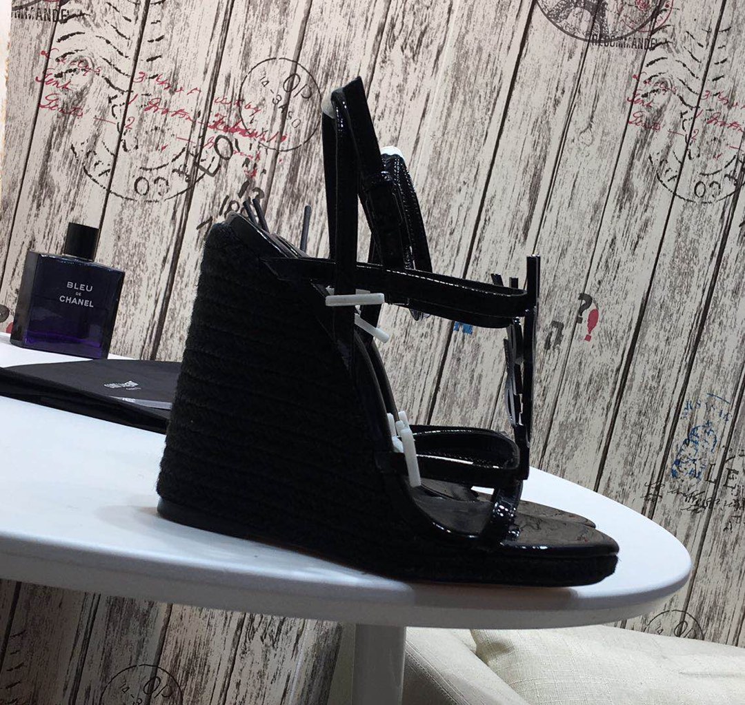 Saint Laurent YSL-CASSANDRA Logo Letter Buckle High-heeled Straw Woven Leather Wedges