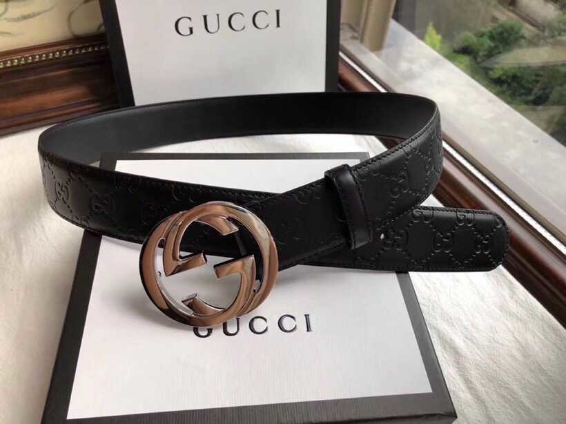 Gucci Exquisite square metal buckle GG embossed black cowhide belt 35mm