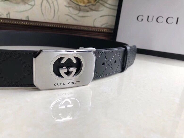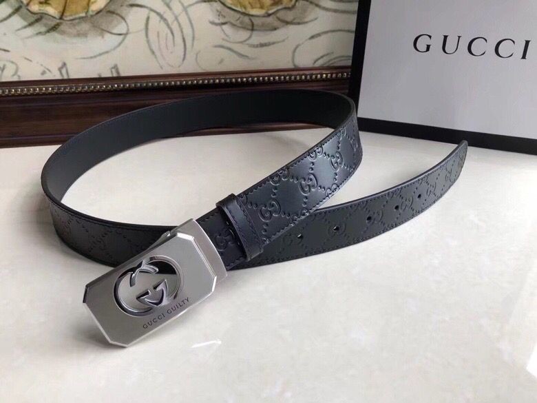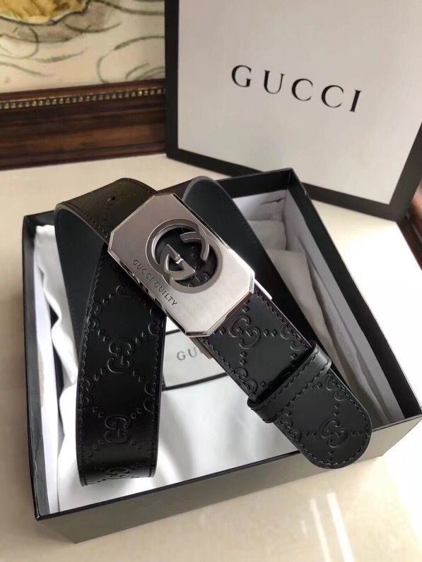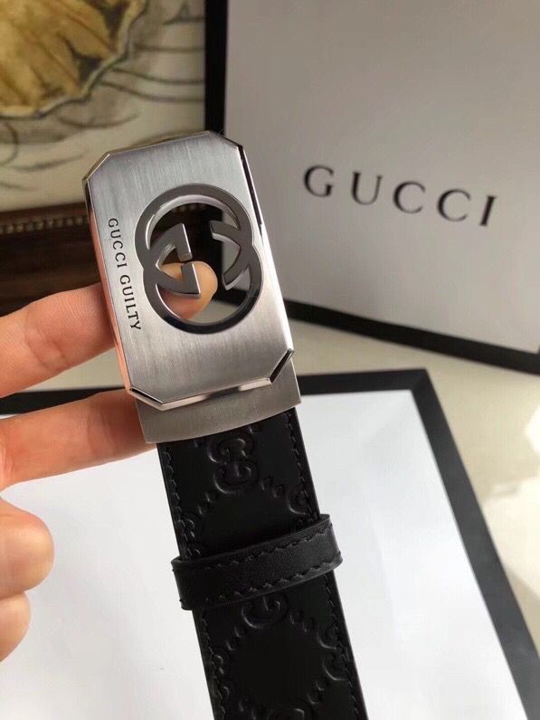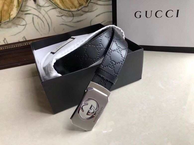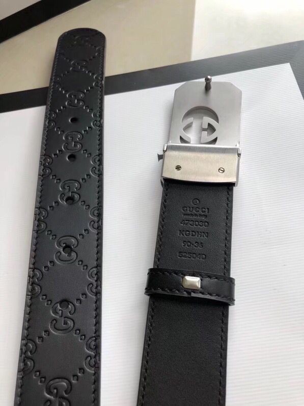 Gucci Exquisite square metal buckle GG embossed black cowhide belt 35mm