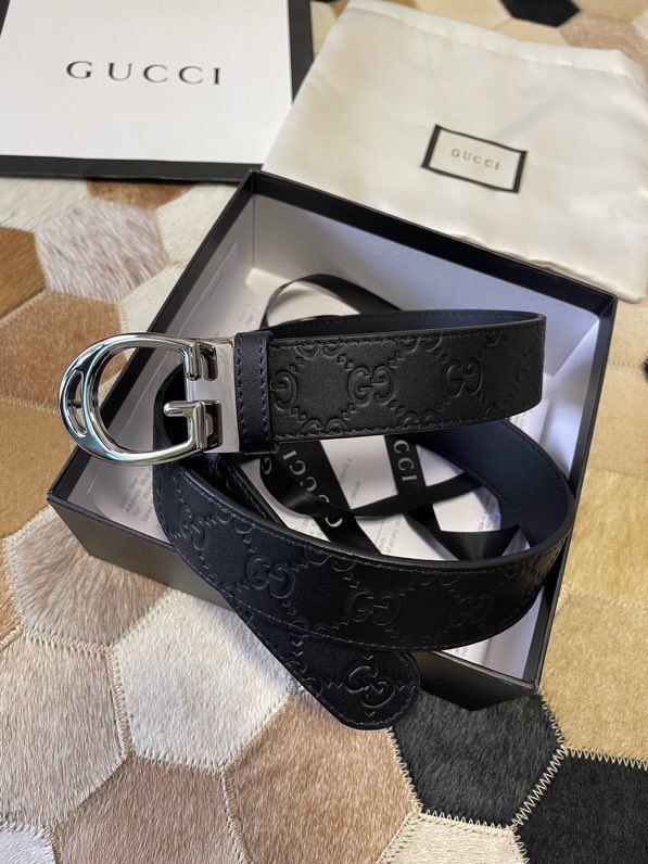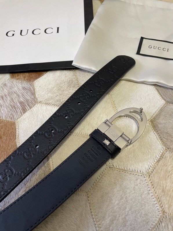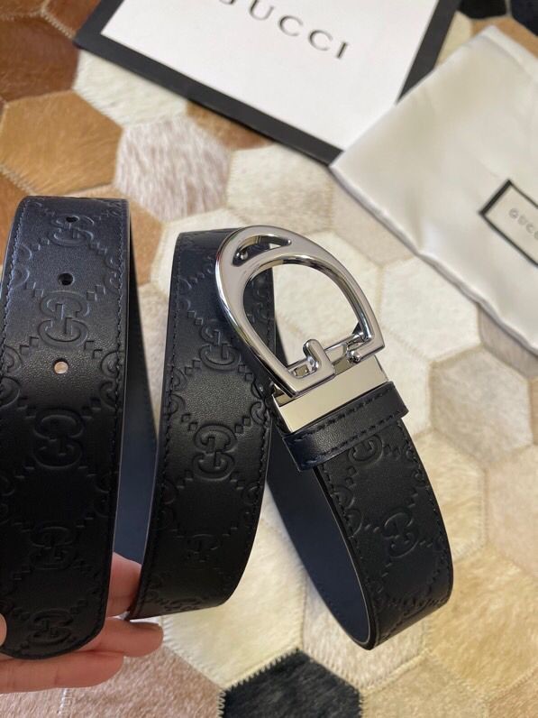 Gucci Exquisite square metal buckle GG embossed black cowhide belt 35mm