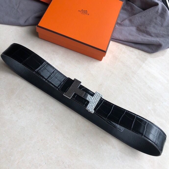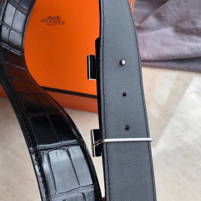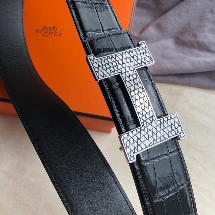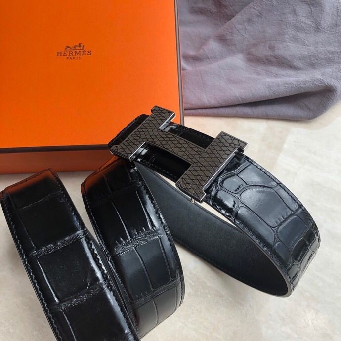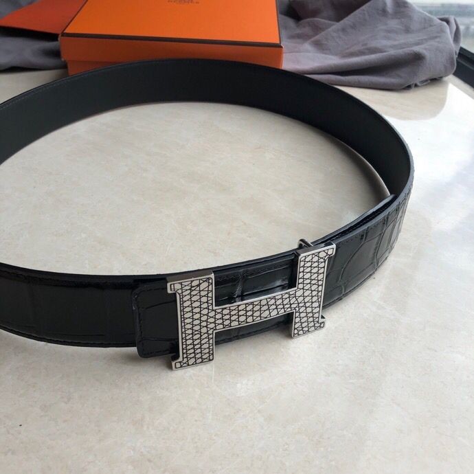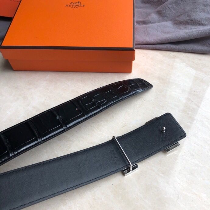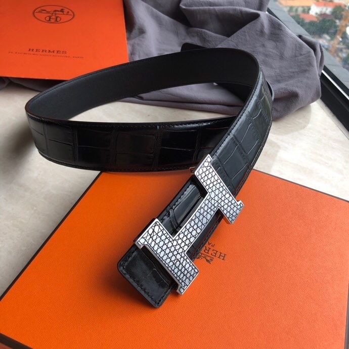 Hermes Stainless steel H pattern metal buckle & cowhide embossed crocodile pattern 38mm belt