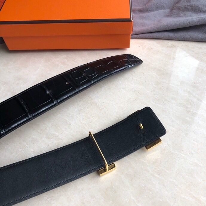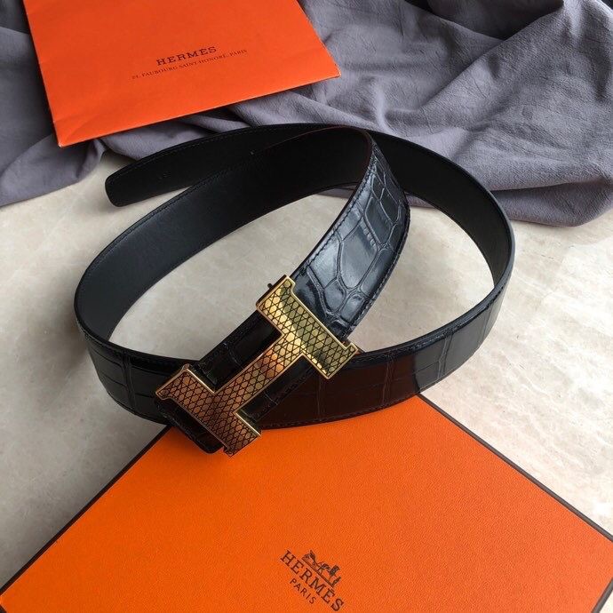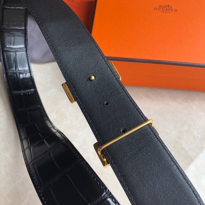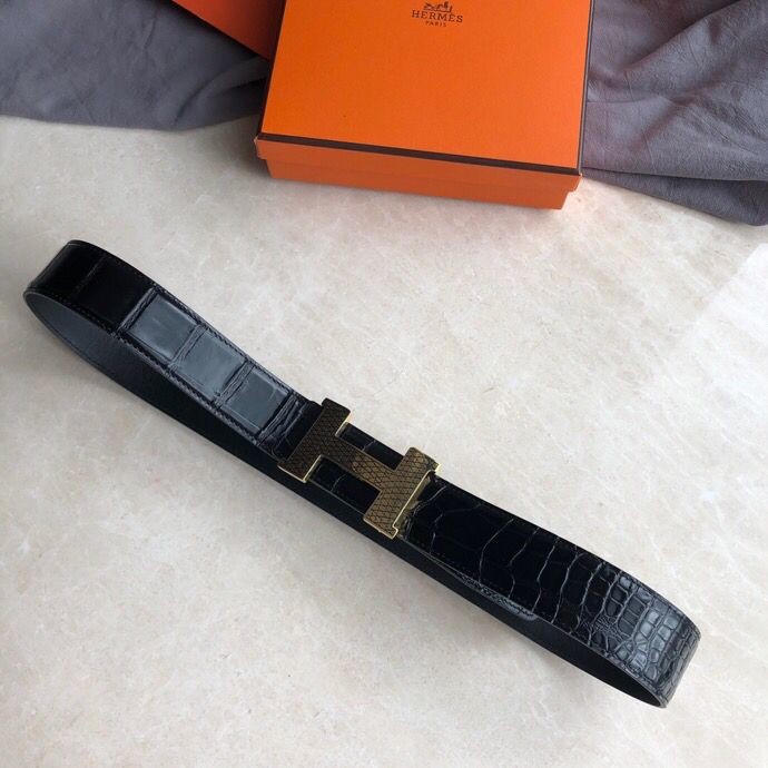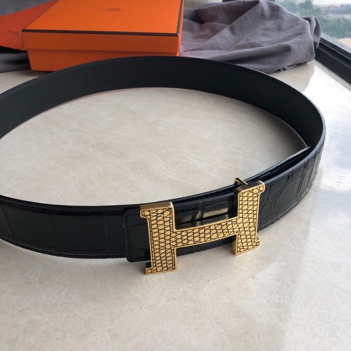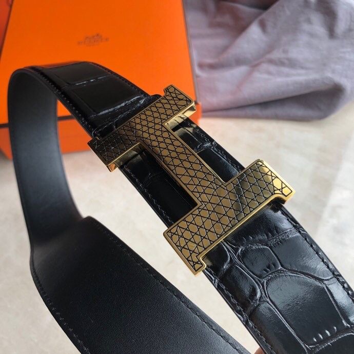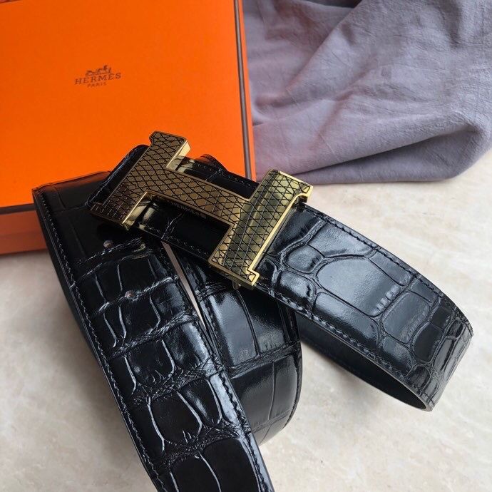 Hermes Stainless steel H pattern metal buckle & cowhide embossed crocodile pattern 38mm belt